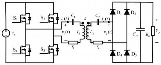 Consider an inductive series-series compensated WPT link, shown in Figure 1 [34], where and symbolize input and output DC voltages, and are primary and secondary inductances, and represent primary and secondary compensating capacitance, and denote primary and secondary equivalent series resistances, indicates coupling coefficient, and and signify load filter capacitance and resistance, respectively. The inverter is operated with bipolar switching at a constant frequency of with a 50% duty cycle, such that