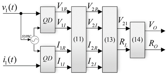 Consequently, feeding v1(t) and i1(t) (cf. (1) and (2)) into separate QDs with the sync signal used to drive the inverter switches would detect the real-time values of the primary-side complex phasor components (cf. (9)) required for the calculation of the corresponding secondary-side variables (11) and (13) and then of the output WPT link quantities (14), as shown in Figure 4.