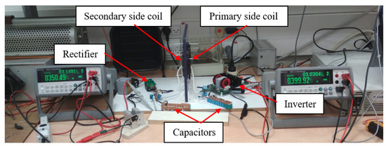 respectively. The system has been designed for power delivery into an enclosed compartment through a 10 mm thick polyvinyl-chloride plate with near-unity voltage gain, as shown in Figure 5. The transmitter-side inverter was utilized by a modified Transphorm TDINV1000P100-KIT 1-kW Inverter GaN Evaluation Platform [37] utilizing 650 V, 150 mΩ TPH3206PSB gallium-nitride field effect transistors (FET) and driven by silicon labs SI8273AB1 isolated drivers. The switching signal was generated by a Taxes-Instrument F28335 digital signal processor. The receiver-side rectifier was performed by Microsemi APT40DQ120BG ultrafast diodes. The system was fed from an IT61517D ITECH high-voltage DC power supply and loaded by a Maynuo M9715 DC electronic load operated in the constant-power mode. A 20 kΩ resistor was constantly connected at the DC output of the inductive WPT link to realize the minimum allowed loading of PO,MIN = 9 W [36]. An interested reader may refer to [34,35,36] for further details. Measured static output voltage versus load power curve was derived in [34] and is reproduced in Figure 6.