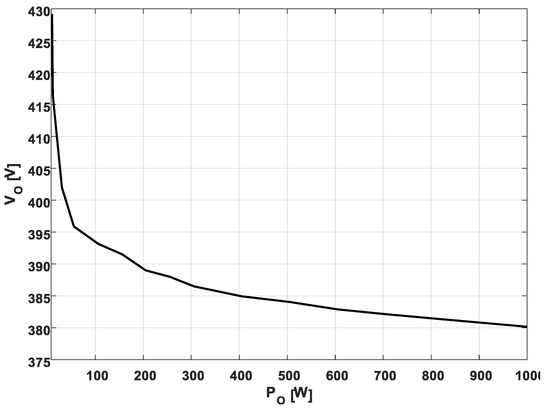 corresponding well with the theoretical predictions in (27) with VO,B = 388 V, VO,MAX = 428 V, PO,B = 250 W, and PO,MIN = 9 W. However, since the algorithm in Figure 4 assumes CCM at all times, its output would be given by the first row of (31) for all of the load levels. In order to include the estimation of VO in DCM, an additional action is applied on the output of (14) in Figure 4 according to (31) to obtain the final estimate as