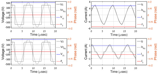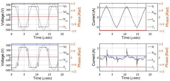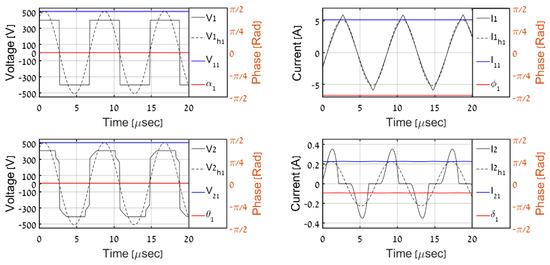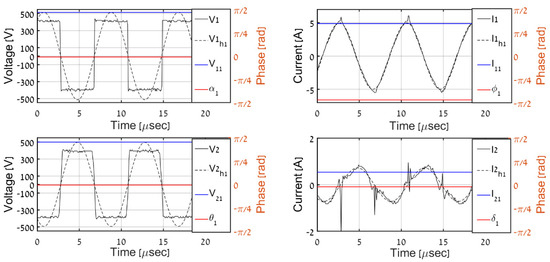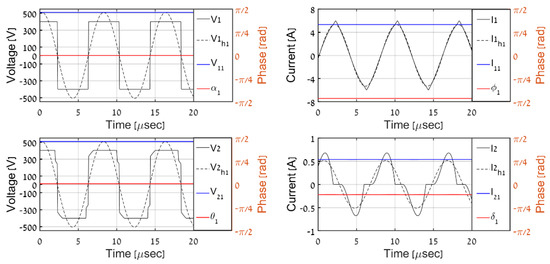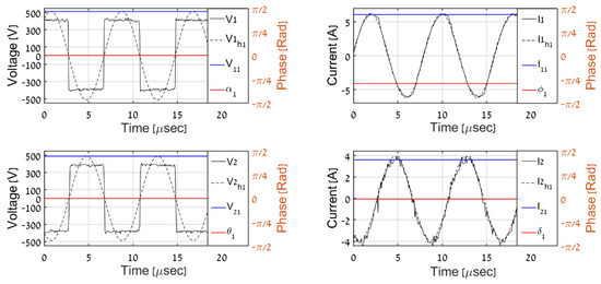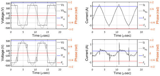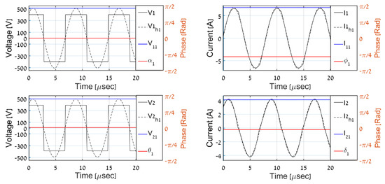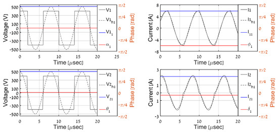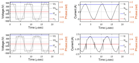 In order to validate the proposed QD-assisted estimation methodology, the system was simulated with primary-side variables employed as real-time inputs, according to Figure 4 with (32) and (34). The real AC-side variables were compared with the predicted ones (recognized by superscript “est” from now on). The time-domain AC-side waveforms for different load levels are shown in Figure 8, Figure 9, Figure 10, Figure 11 and Figure 12, where V1, I1, V2, and I2 denote the primary and secondary AC-side voltages and currents, respectively; V1h1, I1h1, V2h1, and I2h1 symbolize the corresponding first harmonic components (obtained by band-pass filtering); and V11, I11, V21, and I21 with α1, ϕ1, θ1, and δ1 signify the QD outputs (estimated phasors) processed using (21). It is evident that QDs accurately estimate the first harmonic components of primary-side variables and that the proposed algorithm correctly determines their secondary-side counterparts for all of the load levels. Table 2 summarizes the overall estimation algorithm performance. It may be concluded that the estimated values of output voltage and resistance are satisfactory to indicate the correct operation of the system, which is the major goal of the proposed process.