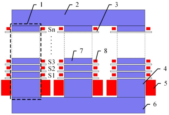 Plane schematic diagram of a three-phase ICT. 1—magnetic core limb; 2—top yoke; 3—insulation sheet; 4—primary core; 5—primary winding; 6—bottom yoke; 7—secondary core; 8—secondary winding. Sn represents the n-th disk.