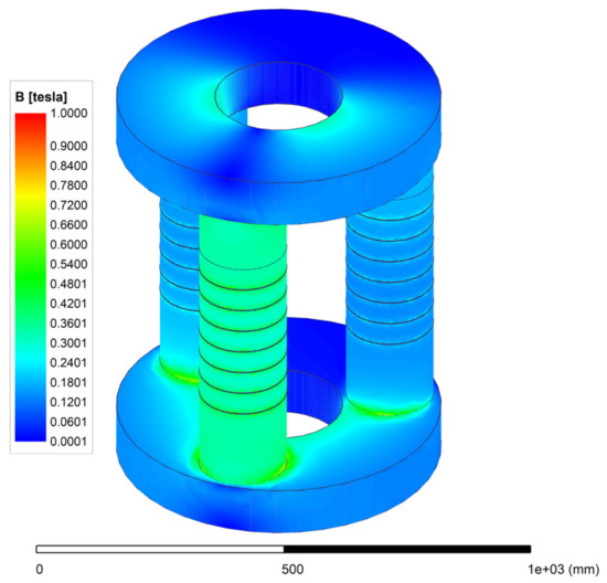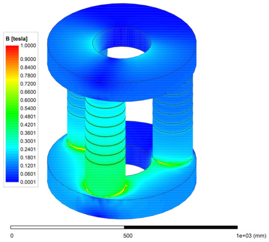 Distribution of the magnetic flux density in the 3D FEM model of the DICT.