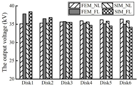 The output voltage distribution of disks at 200 kV under no-load and a full load obtained via FEM and Simulink circuit simulations. NL, no-load; FL, full load.