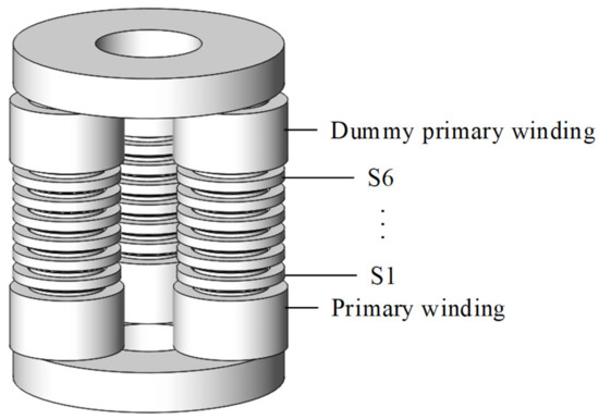 The insulation sheets are usually made of Teflon, mica, etc., for which the magnetic permeability is much smaller than that of electrical steel. Significant magnetic flux leakage is produced by the insulation sheets of ICTs [9,12]. The leakage flux gradually increases from the bottom to the top disk [6,13]. The output voltage of disks is proportional to the working frequency, the flux amplitude, and the number of secondary winding turns. The different output voltages of the disks cause electric potential differences among the disks. On the one hand, the induced voltages of the secondary windings on different disks are different, which results in higher design and manufacturing costs. On the other hand, a permanently damaging electric breakdown tends to occur on insulating sheets between adjacent disks that have a large electric potential difference.