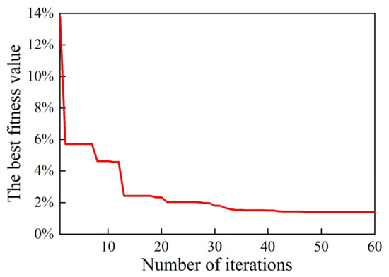 Depending on the design, the number of secondary winding turns is determined to be in the range of 1500–4000, and the compensation capacitance is taken in the range of 100–300 μF. Any phase of the ICT with a symmetric structure contains sufficient mutual inductance information. The problem has six dimensions with solution variables (NS2, NS3, …, NS6, Ccom). The dynamic inertia weight w is in the range of 0.4–0.95, and a linear reduction was carried out by Equation (11) during the training. The population size was set to 100, and the maximum number of iterations was set to 60.