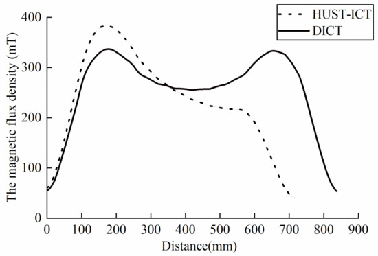 A comparison of the distribution of the magnetic flux density in the central axis of the A-phase core column between the HUST-ICT and the DICT.
