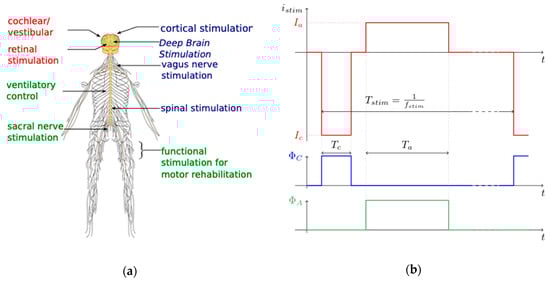 (a) Illustration of some therapeutic applications for electrical stimulation along the nervous system: in red, sensory feedback applications; in green, motor control applications; and in blue, those for the central nervous system. (b) Typical biphasic current stimulation waveform with active balancing. The cathodic current Ic is negative and applied during a time Tc required to trigger excitable cells, and the injected charge is then balanced using a positive anodic pulse of duration Ta. Both pulses are generated with current sources activated by ΦC and ΦA switching commands.