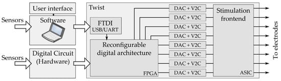 System-level architecture of TWIST: The system can drive up to 8 electrodes in parallel, the stimulation currents are high voltage compliant and generated by an ASIC. The ASIC receives its input from 8 parallel Digital to Analog converters (DAC) and associated voltage-to-current converter (V2C, low voltage). A dedicated digital architecture is implemented on an FPGA. This architecture can be controlled by other circuits or by a software user-interface, using a FTDI for USB connection.