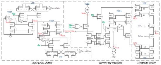 The Logic Level Shifter circuit (Figure 3, on the left) takes as inputs LV logic commands (0–3.3 V) of cathodic or anodic stimulation and generates the signals controlling the switches MH3 and MH4 of the Electrode Driver, respectively SWan and SWcath. The transistor MH3 requires voltage levels from VDD (VDD = 20 V) to (VDD = 3.3 V). The transistor MH4 requires voltage levels from VSS (VSS = −20 V) to (VSS + 3.3 V). This circuit is powered by both LV (VDDA) and HV (VSS and VDD) supplies. The two sub-circuits for anodic and cathodic circuits are symmetrical and only the anodic level shifter will be described further.
