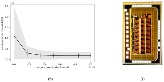 ESCs have been firstly electrically characterized by their static performances. Measurements were performed on three chips (3 × 8 = 24 individual channels). Anodic and cathodic current sources have been characterized using a Keithley 6487 (Keithley, Cleveland, OH, USA) Instruments picoammeter and voltage source. The transfer and output curves are plotted in Figure 9a and the resulting static characteristics are summed up in Table 1. The current gain is slightly under the targeted gain of 5 (see schematic on Figure 4), this gain can be corrected using the digital control circuitry. The gain dispersion remains under the percent. A mismatch between NMOS and PMOS HV transistors has for consequence a difference between anodic and cathodic gains. The equivalent current mismatch has been computed and plotted in Figure 9b. This mismatch is high for low-current values and remains in the range of 2% for currents higher than 300 μA, which is the typical stimulus range with small micro electrodes.