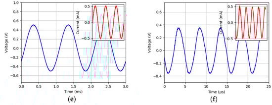 - Biphasic waveforms and bursts: Figure 13a biphasic current with an amplitude sweep on a DBS electrode; Figure 14a,b with a burst pattern on a LIFE electrode.