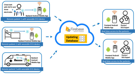 The proposed system is based on smart technologies such as smartphones, cloud technology, and applications to share real-time data with the user’s doctor. After the real-time ECG data are obtained through the wearable DATU and smartphone, cloud hosted Firebase real-time database is used to provide an effective and efficient way to store and share real-time data for a doctor’s analysis. The Firebase real-time database is highly scalable and allows much faster communication between the server and client, with reduced latency. This means that many users can be connected to the Cloud and many doctors can access the patient data simultaneously from the Cloud, without any problems. In addition, security and data validation can be implemented through security rules. Moreover, with the help of the cloud services (such as computing, data analytics, and machine earning), computationally intensive denoising and atrial fibrillation (AF) detection filtering techniques, data analysis, and disease warning can be carried out at the Cloud-end to ease the burden on smartphones.