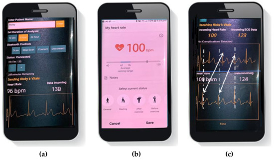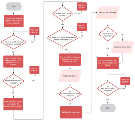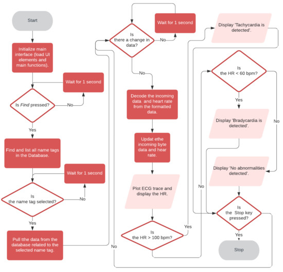 Figure 9 shows the flowchart of the Health ECG Doctor App. The user interface and functions are loaded up at the application launch. As soon as the doctor presses the Find button, the get tag list function is called to pull the available tags in the Firebase cloud database as a list of registered users’ names. When the doctor selects the user, the user’s name is saved. This data change is detected in the corresponding tag and the relevant data is pulled. The formatted data from the Health ECG Patient app is decoded to get back the heart rate and ECG data. The ECG trace and heart rate are then updated in real-time.