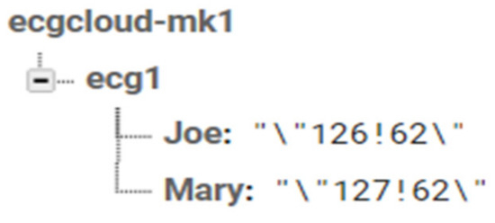 A Firebase Spark plan was registered, allowing storage of data of up to 10 GB per month for free. Figure 8 shows the Firebase data tree stored as JSON objects. The database is named ‘ecgcloud-mk1’ and contains an application bucket named ‘ecg1’. Inside the application bucket is the data sorted by the name tag. Joe is the name of User 1 stored under the first tag and Mary the name of User 2 under the second tag. The user’s data are formatted under each tag using the JSON format.