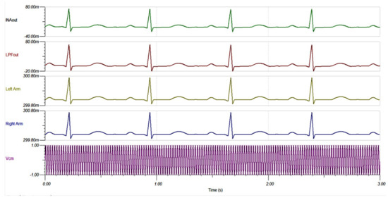 Figure 12 shows the circuit diagram for this simulation. A common-mode noise of 2 V at 50 Hz was added to the circuit via the source. In addition, transient ECG signals [39] were added to the right arm and left arm as signal inputs. In Figure 13, clean ECG signals that were sent to the inputs are named as Left Arm and Right Arm. , INAout and LPFout represent the noise source, INA128 output, and output of the LP filter, respectively. Observing the INAout and LPFout, the circuit can suppress 50 Hz noise completely. In addition, the LPF is not seen to affect the ECG signal. We, thus, conclude that the designed AFE can effectively remove the common mode noise in the ECG signal without affecting its shape and bandwidth.