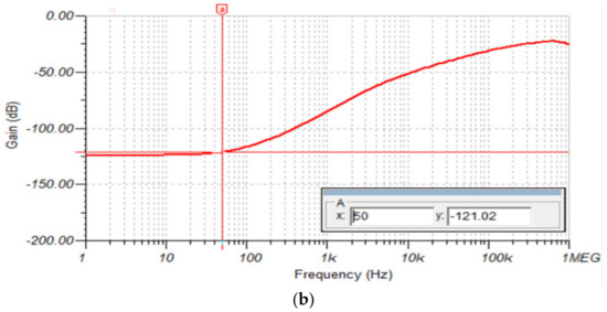 For this simulation, we used the circuit in Figure 12. In this case, CMRR was measured by connecting a , 50 Hz common mode input signal with the differential inputs shorted together. The AFE (without RLD circuit) CMRR plot in Figure 14a shows a CMRR of 85.61 dB at 50 Hz. In contrast, the AFE (with RLD circuit) CMRR plot in Figure 14b shows an increased in CMRR to 121 dB at 50 Hz.