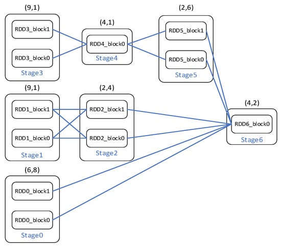 where denotes the long-running stage. The CUs of the RDDs are updated after the candidate scheduling stage sets have been determined. RDDs with a higher CU are more likely to be scheduled first according to the preference of the DAG-aware scheduling method. The cache management policy tracks the process of the stages and updates the CUs of the RDDs. The RDDs with the lowest cache urgency are evicted and that with the highest urgency is prefetched to achieve better computing performance. An RDD that is processed in different stages has various CUs, and the highest value among them is defined as its current CU.