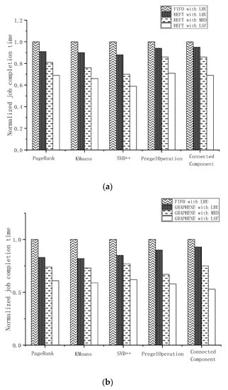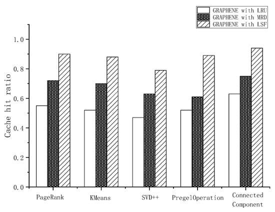 LSF exhibited a significant decrease in the benchmark runtime by increasing the hit ratio of the cache in both DAG-aware task scheduling algorithms. We used a combination of the default scheduler FIFO and default cache management policy LRU as a baseline in Spark. It is clear that the DAG-aware task scheduling algorithm exhibited a performance advantage compared to the default scheduler. HEFT with LRU and GRAPHENE with LRU reduced the JCT by an average of 9% and 15%, respectively, compared to the default FIFO with LRU. As illustrated in Figure 4, HEFT and GRAPHENE with the MRD policy implemented outperformed the same scheduling algorithms with LRU. This was mainly a result of the prefetching method. MRD always prefetches data blocks with the nearest distance in the FIFO scheduler. Although an inconsistency existed between the scheduling order of the DAG-aware task scheduling algorithms and prefetch priority of MRD, the prefetch policy exhibited its advantage in increasing the hit ratio of the cache. HEFT with LSF and GRAPHENE with LSF demonstrated significant performance advantages in our results. GRAPHENE with LSF reduced the job completion time by up to 19% compared to GRAPHENE with MRD in ConnectedComponent. Compared to the default FIFO with LRU, the improvement reached 39%. LSF exhibited better interaction with DAG-aware task scheduling algorithms than MRD and LRU. The hit ratio of the cache during the execution is depicted in Figure 5.