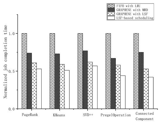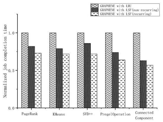 LSF significantly increased the hit ratio of the cache in the jobs scheduled by GRAPHENE. The reference distance in the MRD was calculated according to the FIFO scheduling order. Thus, MRD performed effectively in the default mode but suffered a significant performance loss in the DAG-aware task scheduling algorithm. Thus, LSF exhibited its efficiency in DAG-aware task scheduling algorithms, and its advantages will be expanded in memory-constrained situations.