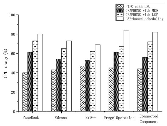 As illustrated in Figure 7, the cache-aware task scheduling algorithm with LSF outperformed FIFO with LRU and GRAPHENE with MRD by an average of 48% and 23%, respectively. Moreover, it achieved a performance improvement of approximately 12% compared to GRAPHENE with LSF. Particularly on the CPU-intensive benchmarks, such as PregelOperation and ConnectedComponent, the cache-aware task scheduling algorithm reduced the JCT by up to 15% compared to GRAPHENE with LSF. Cache-aware scheduling calculates the remaining resources and estimated JCT that are dynamically associated with the cache management policy. It postpones certain stages with negligible overheads to reduce resource fragmentation, which improves the overall JCT. The CPU utilization during the execution is depicted in Figure 8. Our cache-aware task scheduling algorithm made full use of the SIT and achieved better performance in reducing the CPU fragmentation.