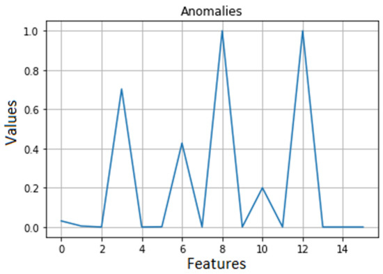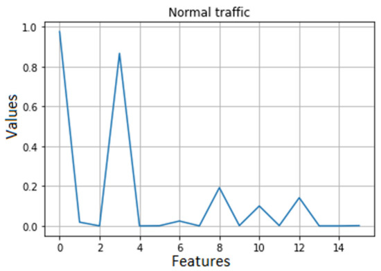 It should be noted that the dataset used in the first experimental case contained a considerable percentage of values generated by anomalies compared to those generated by normal traffic. In the second case, the dataset was almost equally composed of normal traffic data and anomaly data. The difference between the normal values and those in the case of anomalies can be observed in Figure 4 and Figure 5.