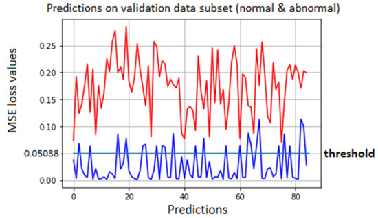 Figure 9 shows how the threshold separates the anomalies from the normal traffic. We obtained good results when observing the predictions on the unbalanced dataset. However, after testing the same model on the balanced dataset, the need to increase the threshold became obvious because of the number of false anomalies in the predictions. We then changed the threshold value, as depicted in Equation (13), to compare the two cases.