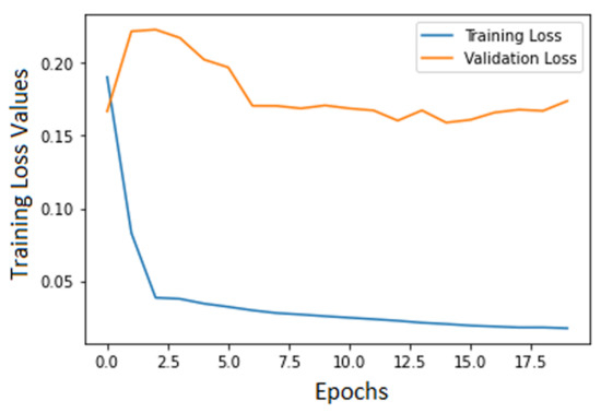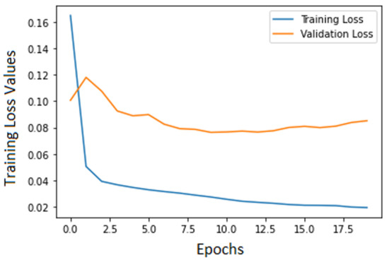 Twenty epochs were sufficient to obtain low values of training loss in both experimental cases. We also tested the model with a larger number of epochs, but the results of the training were not significantly improved. For example, when training the autoencoder with 30 epochs, we observed the training loss to decrease well at the beginning of the training, but after a few epochs, the training loss showed slight decreases to a value close to that obtained with 20 epochs. In the experiments performed with more epochs, training convergence was observed after 18–20 epochs.
