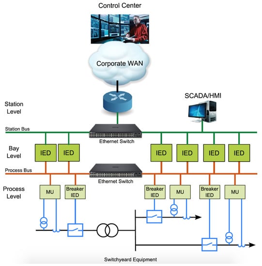 - McGhee, J.; Goraj, M. Smart High Voltage Substation Based on IEC 61850 Process Bus and IEEE 1588 Time Synchronization. In Proceedings of the First IEEE International Conference on Smart Grid Communications, Gaithersburg, MD, USA, 4–6 October 2010. [Google Scholar] [CrossRef]