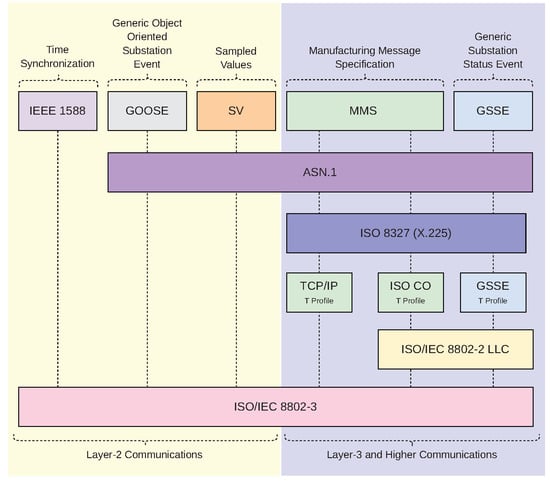 - International Electrotechnical Comission (IEC). IEC 61850-8-1, “Communication Networks and Systems in Substations —Part 8-1: Specific Communication Service Mapping (SCSM)—Mapping to MMS (ISO 9506-1 and ISO 9506-2) and to ISO/IEC 8802-3”; International Electrotechnical Comission (IEC): Geneva, Switzerland, 2020. [Google Scholar]