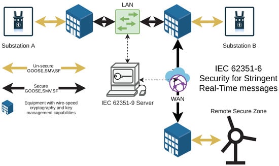 - International Electrotechnical Comission (IEC). IEC 62351-9, “Power Systems Management and Associated Information Exchange—Data and Communications Security—Part 9: Cyber Security Key Management for Power System Equipment”; International Electrotechnical Comission (IEC): Geneva, Switzerland, 2017. [Google Scholar]