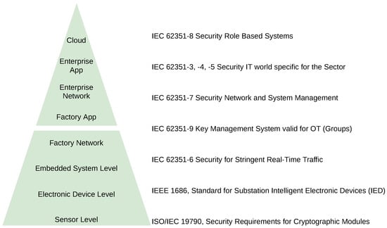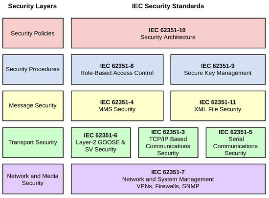 - International Electrotechnical Comission (IEC). IEC 62351, Security Standards for the Power System Information Infrastructure. 2017. Available online: https://webstore.iec.ch/publication/6912 (accessed on 2 August 2021).
