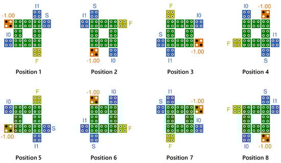 In this paper, two different energy-efficient MUX designs are proposed. These low-power designs are characterized by the relative positioning of the cells in the architecture. The first QCA structure of the proposed MUX is shown in Figure 1a. This is a square-like structure with three inputs (), one constant, and one output (F). The constant is always set at logic 0, i.e., with a charge of −1.00. The input which is near the selector input is the most significant bit in this MUX. The input diagonally opposite to the selector is the least significant bit, which is in this case. An alternate design is also possible by changing the constant to logic 1. In this case, the inputs and will interchange their positions as shown in Figure 1b. Throughout this paper, the designs of the proposed MUX with constant logic 0 and logic 1 are known as MUX1 and MUX2, respectively. The availability of MUX1 and MUX2 will give the options of selecting the best structure for designing different efficient-energy circuits.