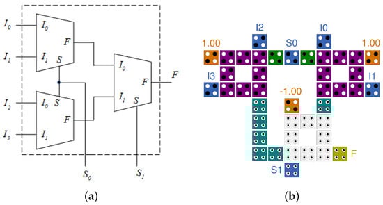 There are many well-known techniques such as binary decision diagram (BDD) for implementing any logic functions using MUXes. For instance, we can design a MUX using three MUXes. In addition, an MUX using three MUXes, etc. In addition, there are further simplification techniques available to reduce the number of MUXes in the design []. A MUX has four input lines, two selector lines, and one output. An abstract diagram of a MUX design using three MUXes and the QCA implementation are shown in Figure 3a,b, respectively.