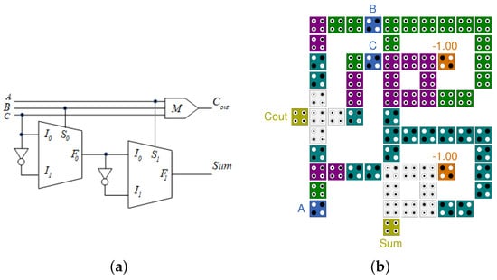 As discussed earlier, a MUX can perform all the two-input functions without using any additional logic gates. This will give the designer the option to develop any logic circuit with only MUXes. However, by considering the available basic special QCA structures, the circuit can be further optimized in view of functional, physical, and geometrical levels. Such a design for the full adder using the MUX and majority logic gate was discussed in Section 2.4.