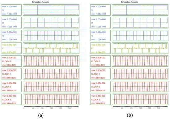 Simulation results of the proposed MUXes: (a) MUX1; (b) MUX2.