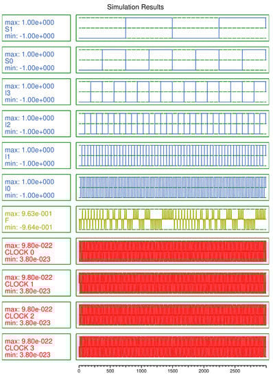 A MUX can be designed by cascading the MUXes. The simulation result of a MUX using the proposed MUXes is shown in Figure 6.