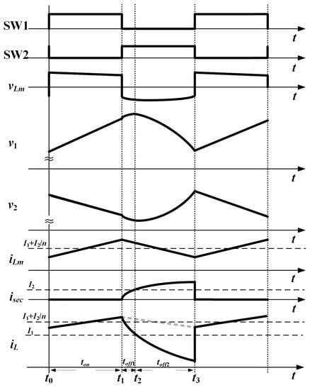 The following describes the current symbols indicated in Figure 1. I1, I2, ic1(t), and ic2(t) are the primary side load current, the secondary side load current, and the current flowing into C1 and C2, respectively. Additionally, iLm(t) is the current flowing through a magnetizing inductance, and ipri(t) and isec(t) are the currents flowing through the primary and secondary sides of the coupled inductor. Finally, iL(t) represents the sum of ipri(t) and iLm(t).