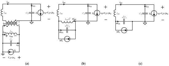In more detail, the configuration of the primary and secondary sides in the flyback mode can be expressed as Figure 4a. By reflecting the primary side into the secondary side, the equivalent circuit in Figure 4b can be obtained. Here, for the convenience of analysis, assuming that the impedance of the Lm is large enough, the equivalent circuit can be simplified as shown in Figure 4c. From Figure 4c, it can be seen that the fly-buck converter operates by the resonance of Llk, C1, and C2, unlike the conventional flyback converter during flyback mode operation.