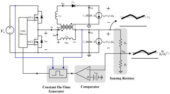 In terms of fly-buck converter control, the primary side of the fly-buck converter has the same structure as the synchronous buck converter, so the control techniques applicable to the synchronous buck converter such as voltage mode control, hysteresis control, constant-on-time (COT) control can be used as it is. Among them, COT control is one of the most commonly used control techniques. Since COT control does not require a loop compensation network, it can achieve a fast transient response and make design easier. Accordingly, in [], COT control has been applied to the fly-buck converter. In particular, the literature compared the control dynamic and voltage regulation when voltage mode control and COT control were, respectively, applied to a fly-buck converter. As a result, in COT control, the control dynamic was excellent, but the voltage regulation characteristic was inferior.