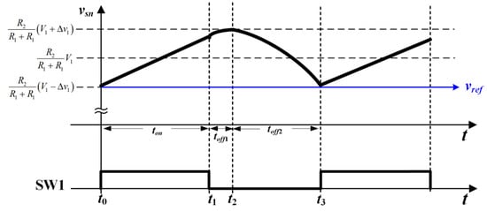 Figure 5 shows the block diagram of the COT controlled fly-buck converter. In COT control, the turn-on signal of SW1 is generated when the minimum value of the sensed output voltage, vsn(t), becomes smaller than the reference voltage, vref. Therefore, when the magnitude of Δv1(t) increases, V1 value moves away from the reference value, and the voltage regulation deteriorates. It can be understood more intuitively in Figure 6 that shows the enlarged waveform of the sensed output voltage.