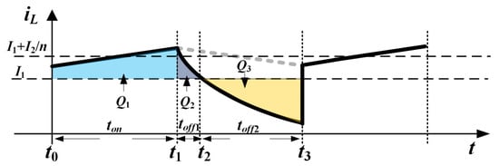 Figure 7 shows the steady-state waveform of iL in the primary side of the fly-buck converter. From Figure 7, it can be seen that the charge amount of C1 is the sum of Q1 and Q2, and the discharge amount is Q3. Therefore, in the fly-buck converter, Equation (14) can be rearranged as:
