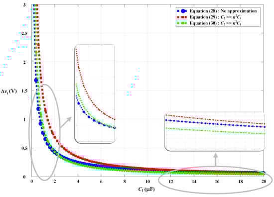 Figure 8 shows the change in Δv1 according to the design of C1 at rated power in the fly-buck converter designed with the parameters in Table 1 and Table 2. In Figure 8, it can be seen that the approximation of C2 >> n2C1 is more accurate in the region where C1 is small and vice versa in the region where C1 is large. From the above, it was confirmed that by using Equations (29) and (30), C1 can be designed in consideration of the secondary load from the viewpoint of output voltage regulation. Therefore, the COT controlled fly-buck converter can be designed using a suitable approximation for target applications. Additionally, based on Equations (29) and (30) and Figure 8, it can be seen that the larger C1 is, the more desirable in terms of voltage regulation. However, COT control is performed based on the ripple of the output voltage. Therefore, if C1 is too large, the ripple magnitude will be too small to control, which must additionally reflect the ripple generation technique that can complicate the overall system. Consequently, in a COT-controlled fly-buck converter, C1 must be designed large enough to satisfy the desired voltage regulation, but at the same time be small enough to generate a ripple voltage for COT control.