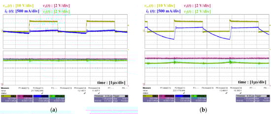 First, to verify the effect of the energy transferred to the secondary on the voltage regulation, C1 was designed as 10 μF and then the experiment was conducted by gradually increasing the secondary load current. The experimental waveforms of the voltage across the low side switch (vsw(t)), the sum of the currents flowing through the magnetizing inductor and the primary side coupled inductor (iL(t)), the primary side output voltage (v1(t)) and the secondary output voltage(v2(t)) of the fly-buck converter are shown in Figure 9a,b. The experimental conditions are when the secondary load power P2 is 1 W and 5 W, respectively. When P2 is 1 W, V1 is 12.145 V, and when P2 is 5 W, V1 is 12.464 V, which is consistent with the analysis that voltage regulation characteristics worsen as the secondary load increases. Additionally, as can be seen from Equation (10), it was also confirmed that V2 decreased as the secondary load current increased.