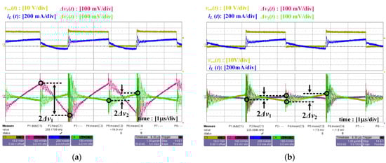 Next, to check the changes in the ripple voltage according to the design of C1, Δv1 and Δv2 were observed while changing C1 in a situation where the primary output power, P1, and the secondary output power, P2, were set to 1 W. Δv1 and Δv2 were observed by magnifying the output voltage in AC coupling mode. Figure 10a,b show the experimental waveforms when C1 is 390 nF and 10 μF, respectively. When the noise component is excluded in Figure 10a where C1 is 390 nF, Δv1 is observed to be about 260 mV, while in case of Figure 10b where C1 is 10 μF, Δv1 is observed to be about 10 mV. These experimental results show that the smaller C1, the greater the Δv1, and the higher the operating frequency as v1 discharges faster. On the other hand, in the case of Δv2, since C2 and P2 do not change, it shows a value that hardly changes.