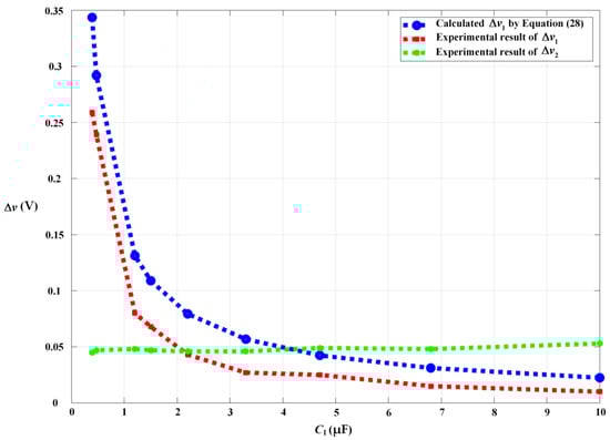 Figure 11 is a graph drawn by comparing calculated Δv1 by Equation (28) with the observed Δv1 and Δv2 excluding switching noise while increasing C1 from 390 nF to 10 μF. As can be seen, for Δv1, there is a small error, but the overall trend is consistent with the analysis. In contrast, for Δv2, since the values of C2 and P2 are constant, almost the same value is maintained regardless of C1. Thus, the validity of the analysis was verified through experiments, and it was confirmed that C1 should be designed in the consideration of the load power transferred to the secondary side in order to improve the voltage regulation characteristics.