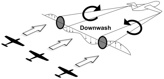 Leader and follower aircraft schematics sweeping through the wake vortex.