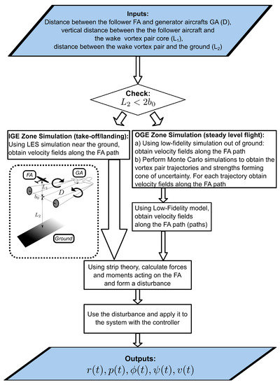 The evolution of the wake vortex was simulated by the Wake Vortex Safety System (WVSS) [45] in the out-of-ground effect zone (OGE) as well as in the in-ground effect zone (IGE), where the interaction of the wake vortex and surface boundary layer occurs. The forces and moments acting on the follower aircraft (FA) in both zones are calculated using the velocity field obtained from the simulations using the strip theory and form the disturbance (Equation (1)). In the rest of the paper, the steady level flight regime denotes the wake vortex/aircraft interaction in the OGE zone, and take-off/landing regime describes the interaction in the IGE zone.