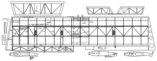 where M is the internal moment acting on a given section, is the vertical distance to the neutral axis, and is the area moment of inertia. According to the measurements taken from the wing drawing, the approximate ultimate stress for the wing was calculated based on the data from Table 2 using the linear interpolation for the particular size of the thickest stringer and was equal to 9558 psi. For each simulation, the stress was estimated for every stringer.