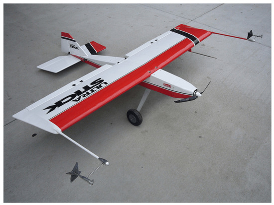 For further comparison of linear vs. nonlinear control designs, here, we employ a linear, parameter-varying (LPV) model based on a small fixed-wing UAV. The UAV selected for numerical simulations is the Ultrastick 120 for which the aerodynamics and flight dynamics have been widely studied [47,48]. Figure 6 shows a picture of the UAV airframe. The LPV model is created by linearizing the nonlinear equations of motion about a set of equilibrium points. Here, the LPV model of the Ultrastick 120 holds a constant pitch/yaw angle and varying airspeed.